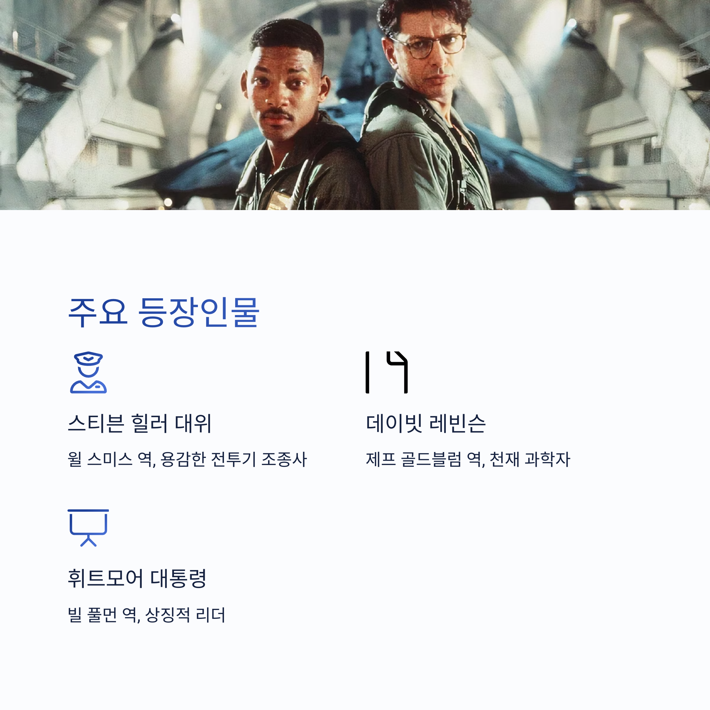 이 영화는 다양한 인물 군상을 통해 외계 침공 상황을 입체적으로 보여줍니다. 윌 스미스는 전투기 조종사 스티븐 힐러 대위로 출연하여 유쾌하고 영웅적인 모습을 선보이며 세계적인 스타로 도약했습니다. 제프 골드블럼은 위성 전문가 데이빗 레빈슨 역으로, 냉철한 두뇌와 재치로 위기를 극복하는 인물입니다. 빌 풀먼은 미국 대통령 토머스 J. 휘트모어로, 상징적인 연설 장면을 통해 국민적 영웅이 됩니다. 그 외에도 다양한 민간인, 군인, 과학자들이 등장하며, 각자의 위치에서 위기를 극복해나가는 과정이 감동을 자아냅니다.